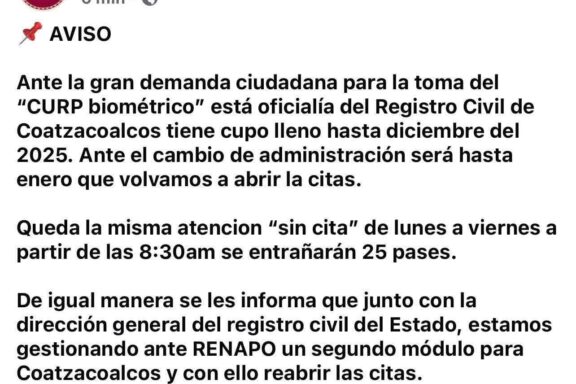 José Vargas. Coatzacoalcos, Ver. – Debido a la alta demanda ciudadana, el Registro Civil de Coatzacoalcos informó que ya no hay disponibilidad de citas para la toma del CURP biométrico durante lo que resta del año 2025. Las citas se reanudarán hasta enero de 2026, una vez que se concrete […]
