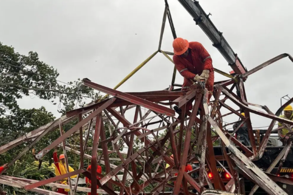 Fuertes vientos, tumban tres estructuras de alta tensión en Coatza; CFE trabaja en su desmantelamiento