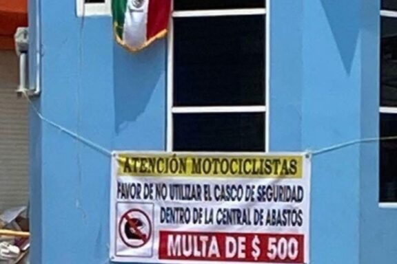 Colocan lona en la Central de Abastos de Minatitlán para prohibir uso de casco en motociclistas