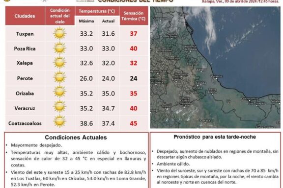 Coatzacoalcos, Ver. REDACCION Desde las primeras horas de hoy, en la ciudad de Coatzacoalcos y el día de ayer, se han presentado altas temperaturas en la zona Sur de Veracruz, pero especificamente Coatzacoalcos, llegó a los 45°. La actualización meteorológica de las condiciones del tiempo en Veracruz, indican que dominan […]