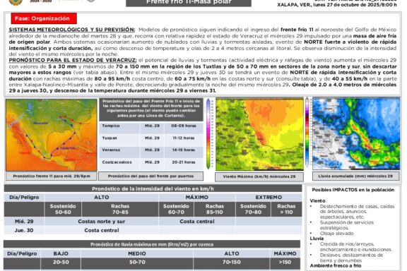 Xalapa, Ver. AGENCIAS Emitieron a la población una Alerta Gris del Sistema de Alerta Temprana para Veracruz en fase de Organización para tomar precaución por posibles vientos del Norte de hasta 95 km/h que podrán ocasionar destechamiento de casas, caídas de árboles, anuncios; así como lluvias que pudieran causar deslaves, deslizamientos de tierra y derrumbes, así como encharcamiento […]