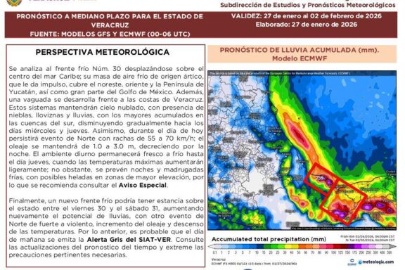 ¡Prepárate! Lluvias y frío extremo golpearán el territorio veracruzano este fin de semana por sistema frontal violento. Xalapa, Ver.- El estado de Veracruz se encuentra bajo alerta meteorológica ante la inminente llegada de un nuevo frente frío, impulsado por una potente masa de aire polar. Según el reporte más reciente […]