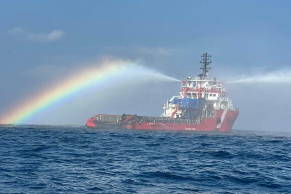 Embarcación especializada recolecta residuos de hidrocarburo frente a la barra de Sontecomapan; playas permanecen limpias.