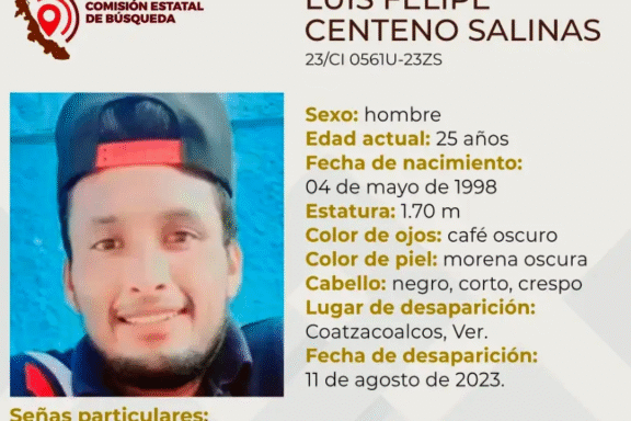 ** Casi todos los días hay una desaparición en esta Ciudad. Coatzacoalcos, Ver. La Comisión Estatal de Búsqueda reportó la desaparición de un joven de 25 años de edad en Coatzacoalcos, Veracruz. Se trata de Luis Felipe Centeno Salinas, quien mide 1.70 metros, es de tez morena oscura, tiene ojos color […]