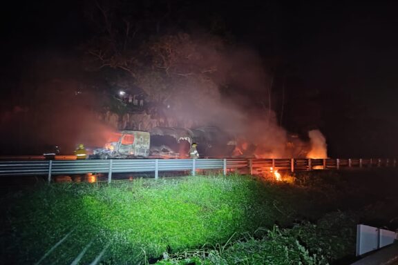 Chocan 2 pipas y se incendia en la autopista Minatitlán-Acayucan; no han podido removerlas, provoca tráfico de 10 kilómetros