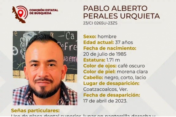 Coatzacoalcos, Ver. AGENCIAS La Comisión Estatal de Búsqueda, reportó la desaparición de un hombre de 37 años de edad en Coatzacoalcos, al sur de la entidad veracruzana. Se trata de Pablo Alberto Perales Urquieta, es de morena clara, tiene ojos color café oscuro y cabello negro, corto y lacio. Como señas […]