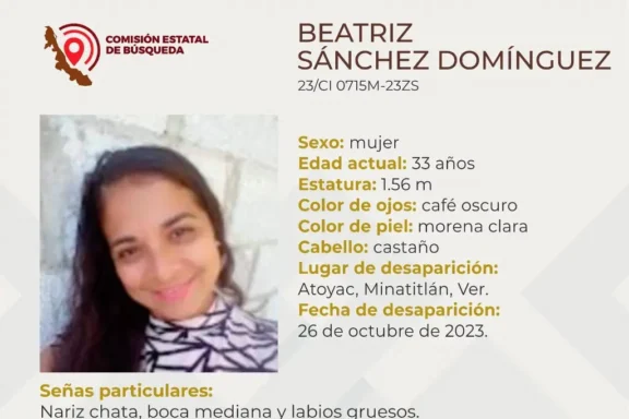 Minatitlán, Veracruz. La Comisión Estatal de Búsqueda reportó la desaparición de una mujer de 33 años de edad en Minatitlán, Veracruz. Se trata de Beatriz Sánchez Domínguez, es de tez morena clara, tiene ojos color café oscuro y cabello castaño. Como señas particulares, tiene nariz chata, boca mediana y labios gruesos. Cualquier […]