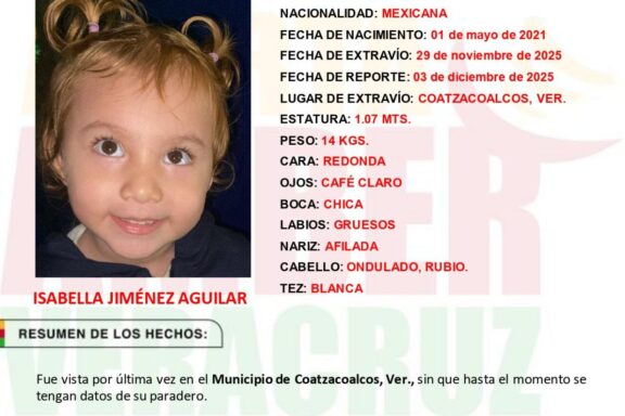 Gregorio Antonio/Coatzacoalcos Desde el pasado 29 de noviembre del presenta año, de encuentra en calidad de d3s4p4r3cid4, una menor de solo 4 años de edad, a quien su familia está buscando por temor a sufrir la comisión de algún delito. Se trata de la niña Isabella Jiménez Aguilar, por quien […]