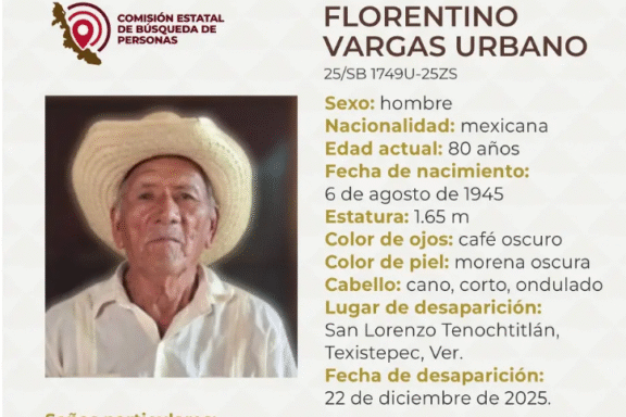 Texistepec, Ver. La Comisión Estatal de Búsqueda reportó la desaparición de un hombre de 80 años de edad en Texistepec, al sur del estado de Veracruz. Se trata de Florentino Vargas Urbano, mide 1.65 metros, es de tez morena oscura, tiene ojos color café oscuro y el cabello cano, corto y ondulado. Como señas particulares, tiene manchas en la […]