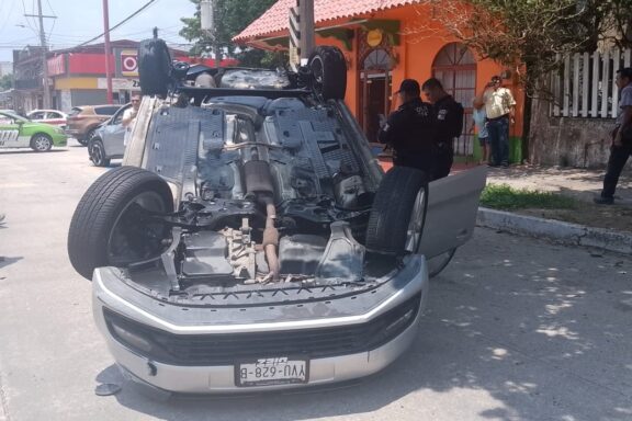 Carambola y volcadura deja un lesionado en pleno centro de Coatzacoalcos