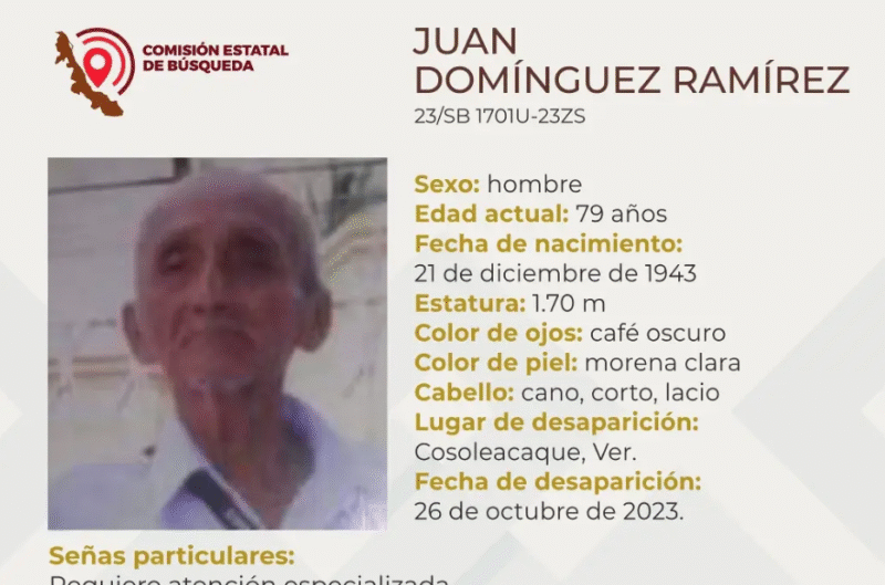 La Comisión Estatal de Búsqueda reportó la desaparición de un hombre de 79 años de edad en Cosoleacaque, Veracruz.