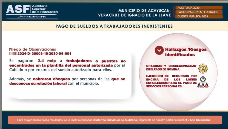 La Auditoría Superior de la Federación (ASF) documentó presuntas irregularidades en el manejo de recursos federales en los municipios de Acayucan y Cosoleacaque, Veracruz, como parte de la Tercera y última entrega de la Fiscalización de la Cuenta Pública 2024. Las observaciones podrían derivar en responsabilidades administrativas e incluso en denuncias penales si no son solventadas conforme a la ley.