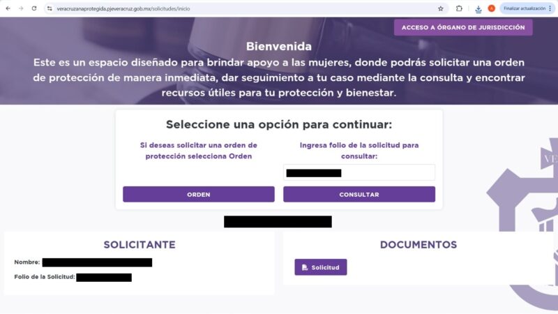 La víctima sufre actos de violencia, situación que derivó en la generación de una solicitud a través de la plataforma Veracruzana Protegida, un procedimiento mediante el cual mujeres en situación de violencia pueden realizar una solicitud en línea que es turnada de forma inmediata a un juez, quien en cuestión de horas puede conceder medidas de protección.