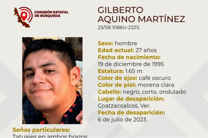 Se trata de Gilberto Aquino Martínez, quien mide 1.65 metros, es de tez morena clara, tiene ojos color café oscuro y cabello negro, corto y ondulado.