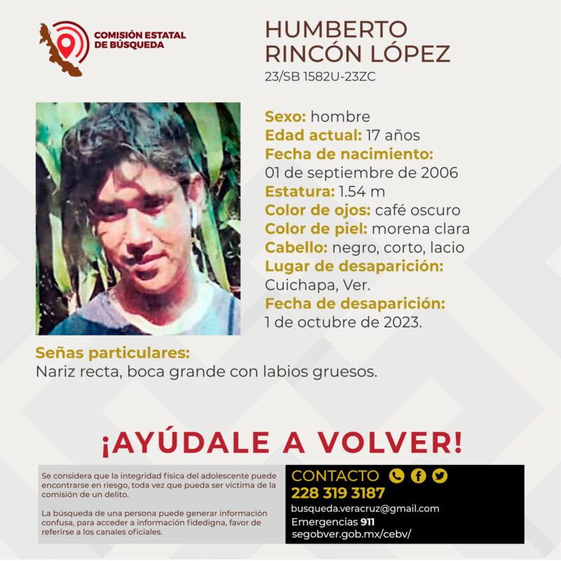La Comisión Estatal de Búsqueda reportó la desaparición de un menor de 17 años de edad en Cuichapa, Veracruz.
