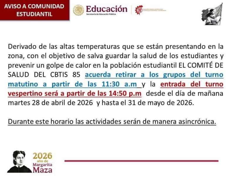 De acuerdo con el acuerdo emitido, a partir del martes 28 de abril y hasta el 31 de mayo de 2026, los alumnos del turno matutino saldrán a las 11:30 horas, mientras que el turno vespertino ingresará a las 14:50 horas. Durante este periodo, las actividades académicas continuarán de manera asincrónica, con el objetivo de no interrumpir el proceso educativo.