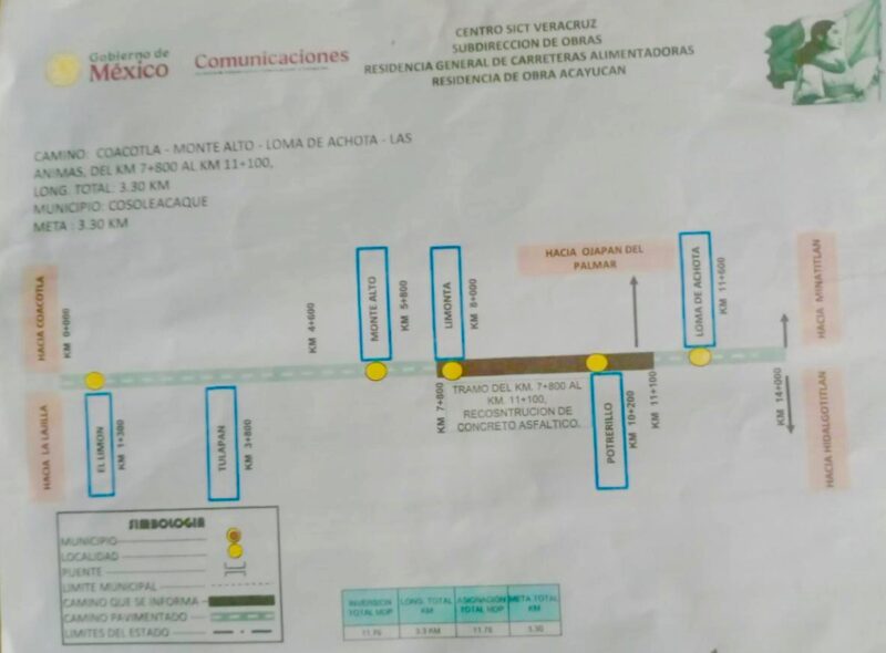 La obra va del camino de Coacotla-Monte Alto-Loma de Achota- Las animas del Km 78+800 al Km 11+100 con una longitud de 14 kilometros y 300 metros del municipio de Cosoleacaque.
