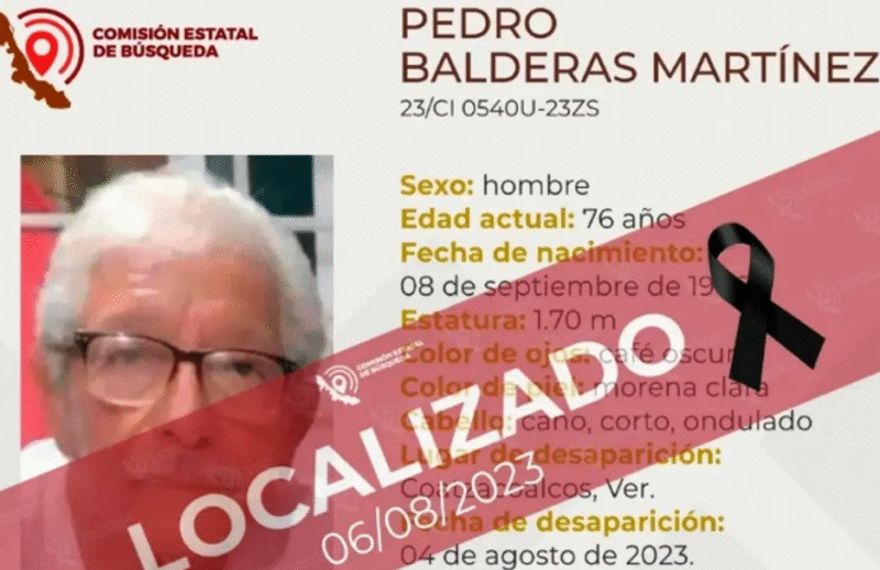 La Comisión Estatal de Búsqueda de Veracruz informó este lunes 07 de agosto que fue localizado sin vida Pedro Balderas Martínez, un hombre de 76 años de edad quien había sido reportado como desaparecido en Coatzacoalcos, al sur del estado de Veracruz.