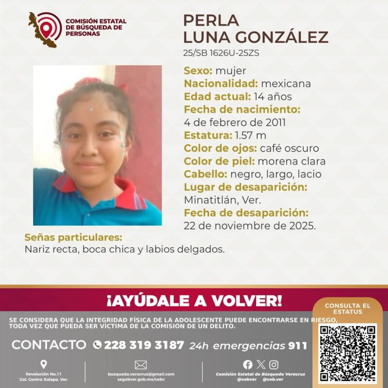 La Comisión Estatal de Búsqueda reportó la desaparición de una menor de 14 años de edad en Minatitlán, al sur del estado de Veracruz.