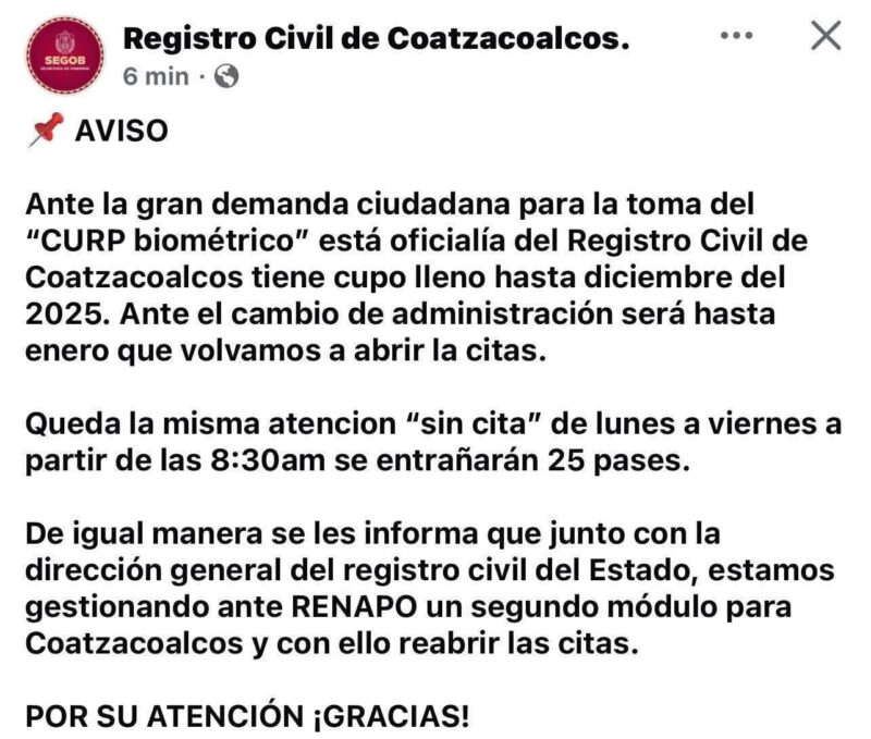Debido a la alta demanda ciudadana, el Registro Civil de Coatzacoalcos informó que ya no hay disponibilidad de citas para la toma del CURP biométrico durante lo que resta del año 2025. Las citas se reanudarán hasta enero de 2026, una vez que se concrete el cambio de administración municipal.