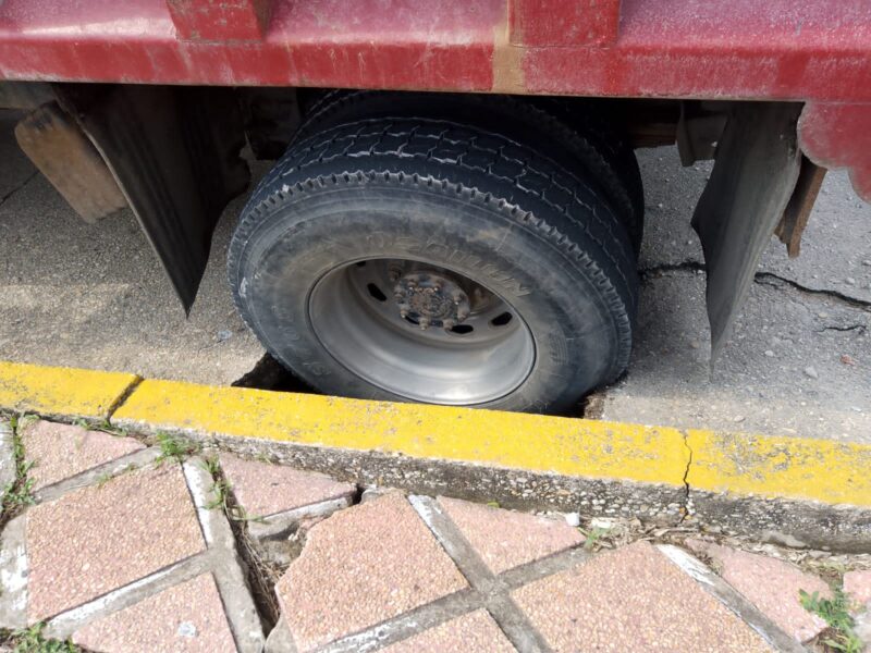 El camión materialista color rojo, sin marca, con placas YM-3063-A, transitaba de norte a sur, alrededor de las 11 de la mañana, sobre la avenida 16 de Septiembre entre Llave y Lerdo de dicho sector, cuando su conductor sitio que se hundió en el pavimento.