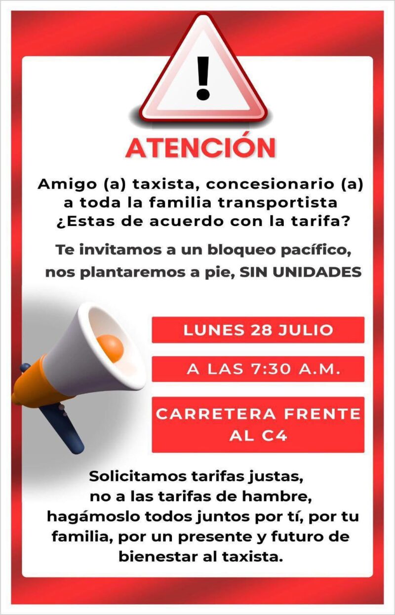 De acuerdo con fuentes del gremio transportista, una de las voces que ha encabezado el llamado a la movilización es Jorge Alberto Montiel Ponce, dirigente taxista en la zona, quien ha convocado a sus compañeros a unirse en defensa de sus derechos laborales y en rechazo a lo que califican como decisiones unilaterales por parte de la autoridad estatal.