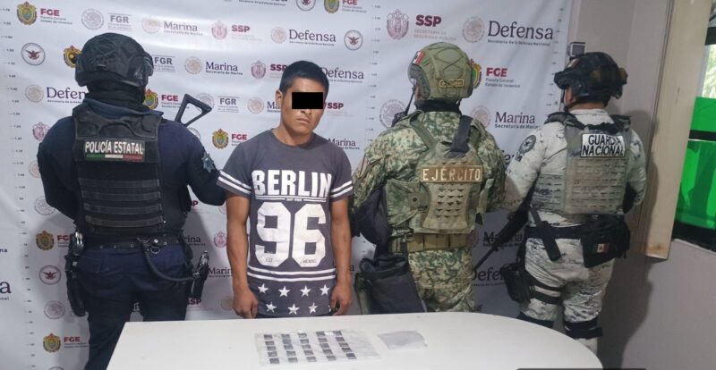 En Tihuatlán fue detenido un masculino por delitos contra las instituciones de seguridad, a quien se le aseguró un arma de fuego corta, cargadores, cartuchos útiles, 14 dosis de una sustancia con características similares al cristal, una báscula, equipo táctico y un vehículo sin reporte de robo.