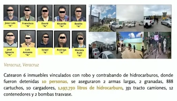 Desde la Base Aeronaval de Las Bajadas, destacó que el pasado 5 de diciembre de 2024, en Veracruz se realizaron seis cateos, con la detención de 10 personas, el aseguramiento de armamento, granadas y más de un millón de litros de hidrocarburo, así como tractocamiones y contenedores.