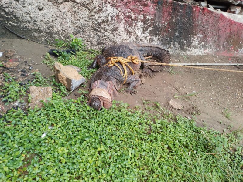Un enorme cocodrilo de la especie moreletii, conocido también como cocodrilo mexicano o de pantano, fue capturado durante la madrugada de este lunes, cuando merodeaba un domicilio de la colonia Fidel Herrera Beltrán.