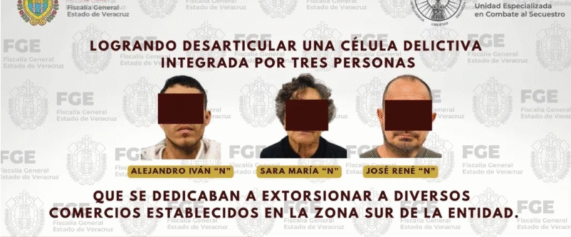 Alejandro Iván “N”, Sara María “N” y José René “N” fueron detenidos e imputados como presuntos integrantes de una célula delictiva dedicada a extorsionar comercios en el sur de Veracruz, quedando los tres bajo prisión preventiva oficiosa.