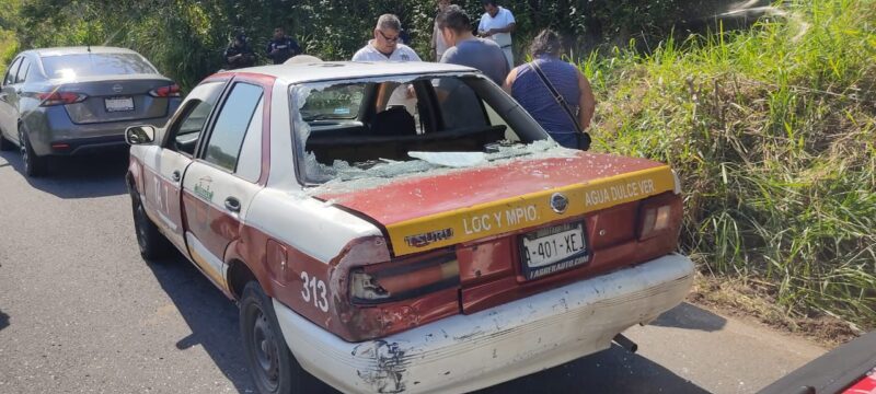 Un aparatoso accidente vial se registró este mediodía en el tramo carretero conocido como El Burro, casi a la salida hacia la carretera Villa–Coatzacoalcos, donde tres taxis se vieron involucrados en una carambola que dejó como saldo dos personas lesionadas y cuantiosos daños materiales.