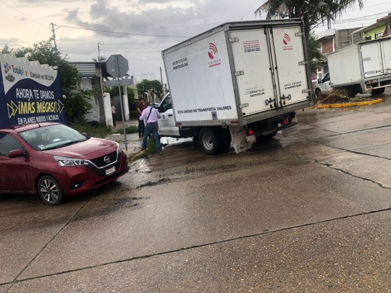 Solo daños materiales, tuvo como resultado un aparatoso accidente que se registró este lluvioso jueves, en calles de la colonia Benito Juárez Norte de Coatzacoalcos.