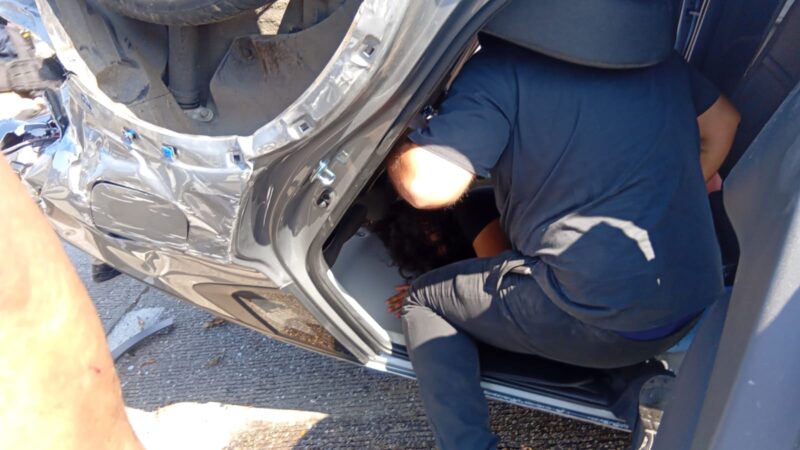 Las unidades involucradas presentaron daños materiales cuantiosos, especialmente el automóvil compacto que terminó con pérdida total tras la volcadura.