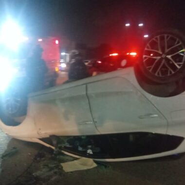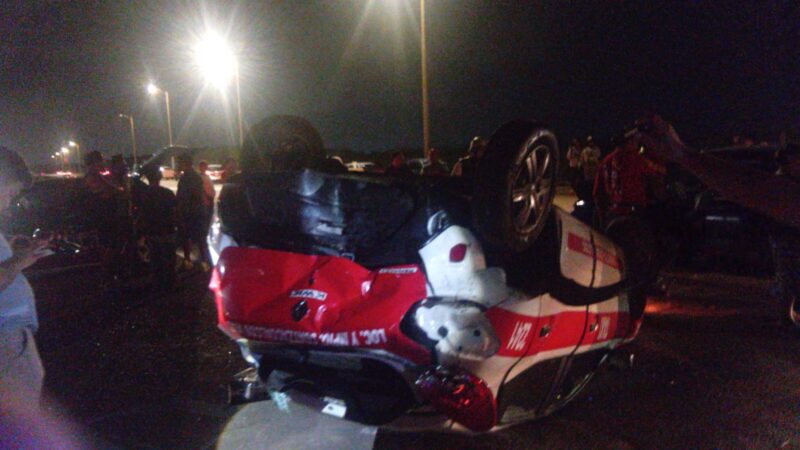 Tras la fuerte colisión, el automóvil de alquiler terminó volcada sobre su techo con los neumáticos hacia arriba.