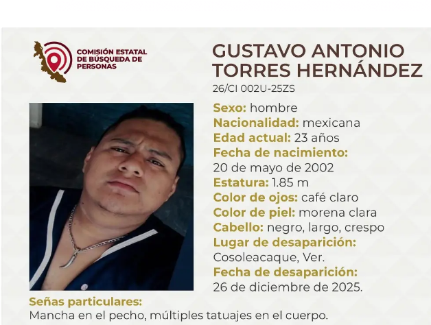 La Comisión Estatal de Búsqueda reportó la desaparición de un joven de 23 años de edad en Cosoleacaque, Veracruz.