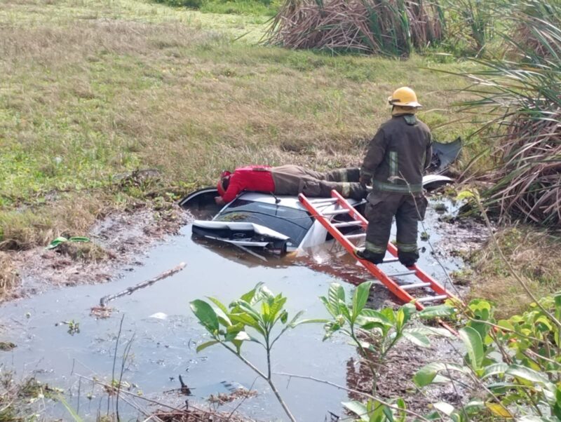 Un automóvil de la marca Hyundai, tipo Grand i10, color gris, en el que viajaban personas en presunto estado etílico, terminó sumergido en el pantano de la carretera a Las Barrillas.