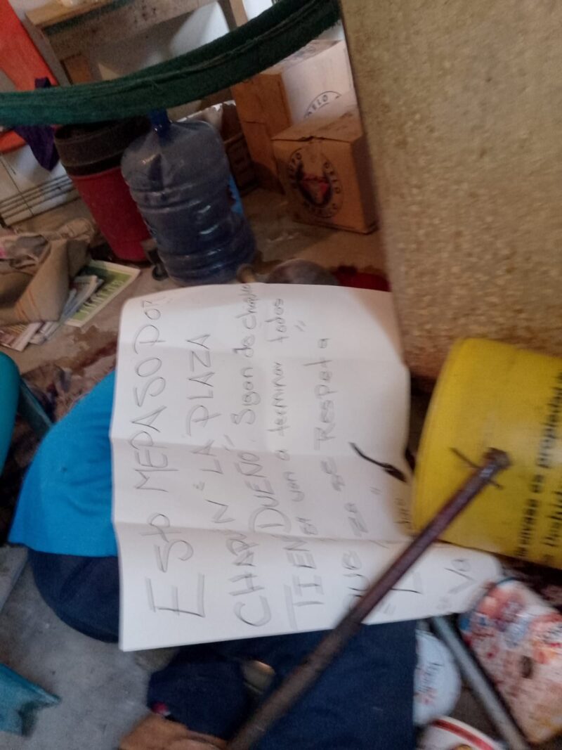 En la cartulina se puede leer: «ESTO ME PASO POR CHAPULIN, LA PLAZA TIENE DUEÑO, Sigan de Chapulines y así van a terminar, porque la plaza se respeta».