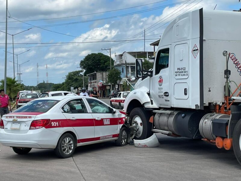 Se trató del taxi marcado con el número económico 931 de Cosoleacaque que fue impactado por un tráiler que transportaba doble auto tanque, ambos con dirección hacia la salida de Minatitlán, mismos que terminaron atravesados en la arteria.
