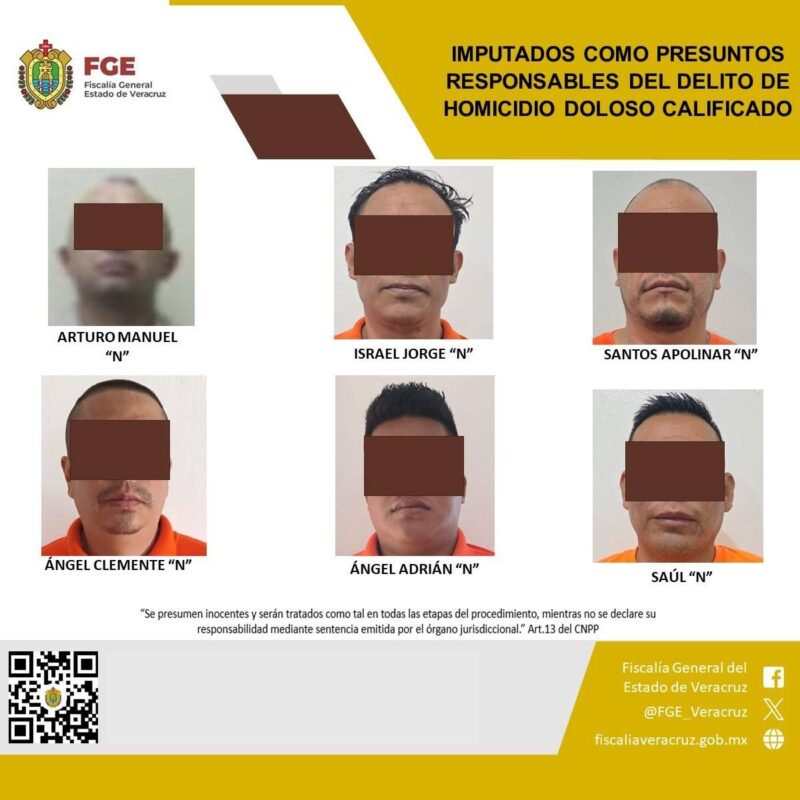 Derivado del trabajo de investigación ministerial, la Fiscalía General del Estado de Veracruz, a través de la Fiscalía Regional Tuxpan, reportó la legalización de la detención y formulación de imputación ante el órgano jurisdiccional en contra de Arturo Manuel “N”, Israel Jorge “N”, Santos Apolinar “N”, Ángel Clemente “N”, Ángel Adrián “N” y Saúl “N”, quienes son señalados por su presunta responsabilidad en el delito de homicidio doloso calificado, cometido en agravio de una víctima cuya identidad se encuentra debidamente resguardada conforme a derecho.
