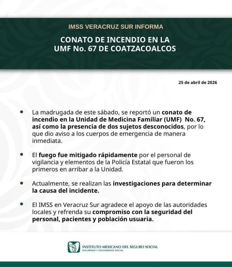 De acuerdo con el reporte oficial emitido por el IMSS Veracruz Sur, el incidente fue atendido de manera inmediata tras activarse los protocolos de emergencia, lo que permitió controlar el fuego sin que se reportaran personas lesionadas ni daños mayores en las instalaciones.