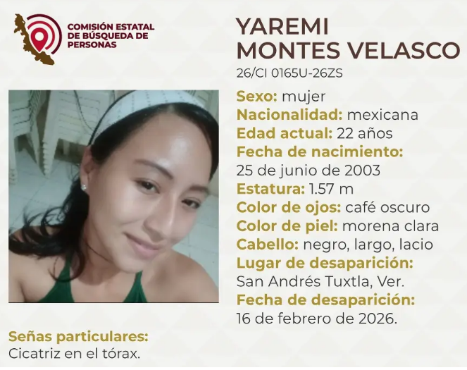 La Comisión Estatal de Búsqueda reportó la desaparición de una joven de 22 años de edad en San Andrés Tuxtla, al sur del estado de Veracruz.