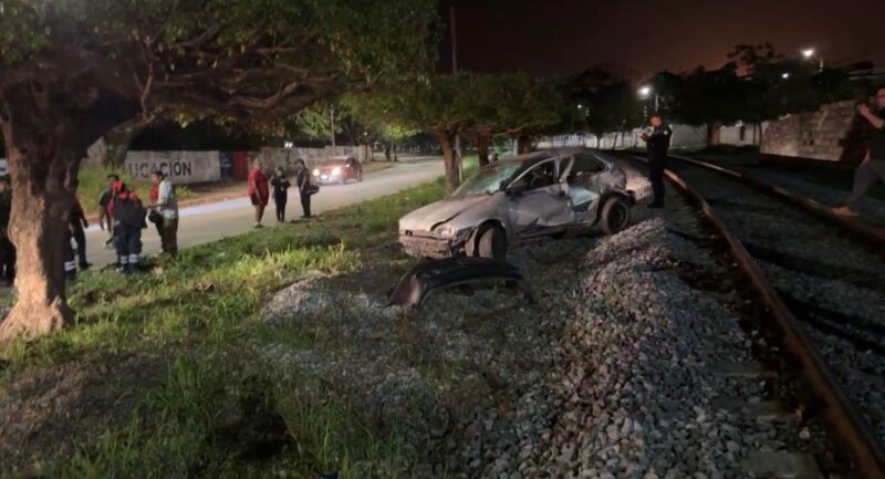 Un aparatoso accidente ferroviario se registró durante las primeras horas de este sábado en el cruce de las calles Fernando López Arias y Manuel Ávila Camacho, donde una locomotora impactó a un automóvil compacto que intentaba atravesar las vías.