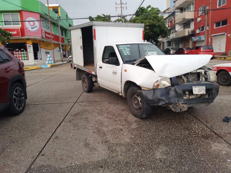Un choque entre una unidad de la Secretaría de Marina (Semar) y una camioneta de paquetería, dejó solo daños materiales cuantiosas, en calles del centro de Coatzacoalcos.