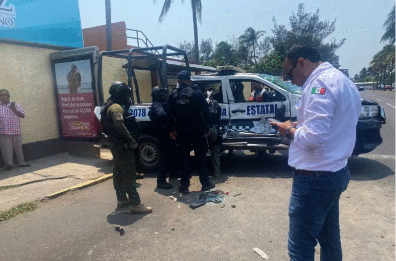 En un fuerte accidente registrado en la ciudad de Boca del Río, un elemento de la Policía Estatal resultó lesionado en partes del cuerpo al quedar prensado al interior de la unidad cuando impactaron a un camión de transporte urbano.
