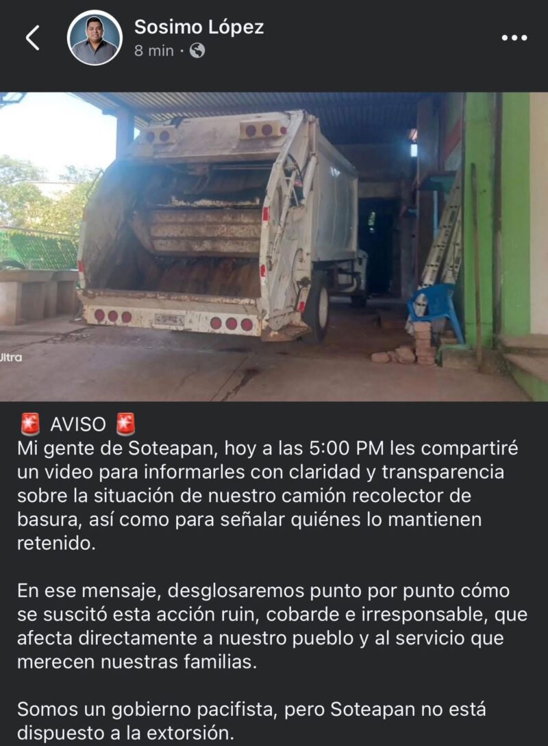 La noche del viernes, el conflicto escaló cuando un grupo intentó tomar el palacio municipal de Tatahuicapan para presionar a las autoridades y agilizar el pago exigido. Sin embargo, habitantes del municipio se organizaron y evitaron la ocupación del inmueble, lo que derivó en la decisión de trasladar el camión recolector a la comisaría ejidal, donde actualmente permanece bajo resguardo.