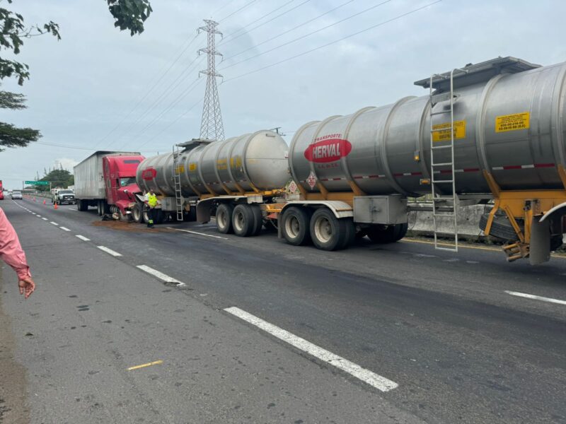 Ante el fuerte choque parte del combustible que era trasladado por uno de los tráilers terminó regado sobre el asfalto, situación controlada por el mismo personal federal que llegó a la escena.