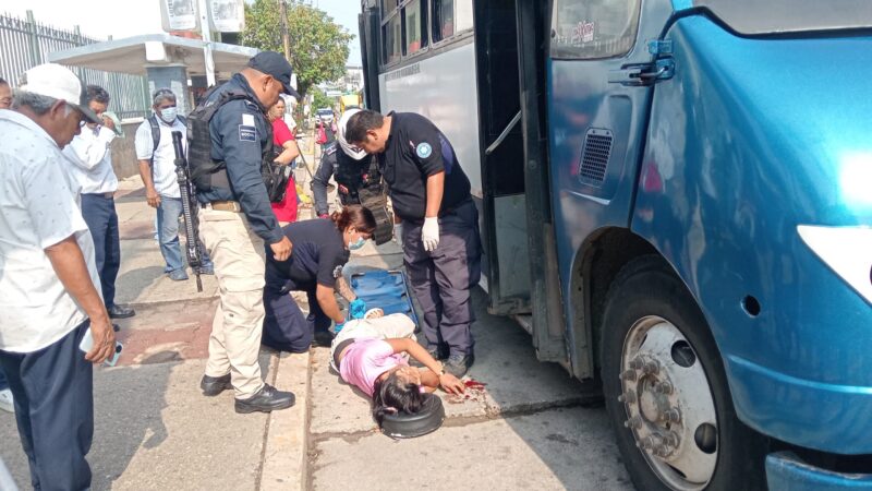 Una mujer fue atropellada por un autobús urbano en la esquina de Ignacio Zaragoza y Venustiano Carranza frente la catedral de San José en Coatzacoalcos.