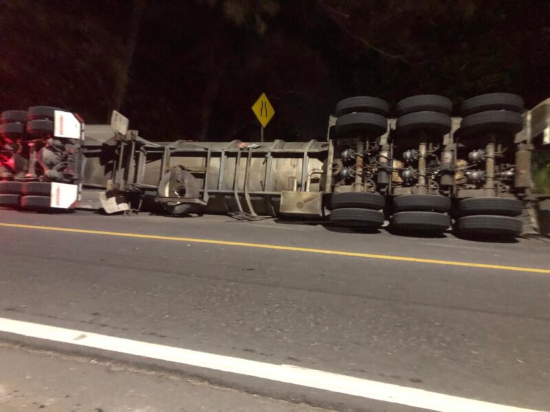 Daños materiales cuantiosos y obstrucción parcial a la circulación, provocó la volcadura de un tractocamion con remolque tipo cisterna, que se registró la marrugada de este miércoles 29 de abril.