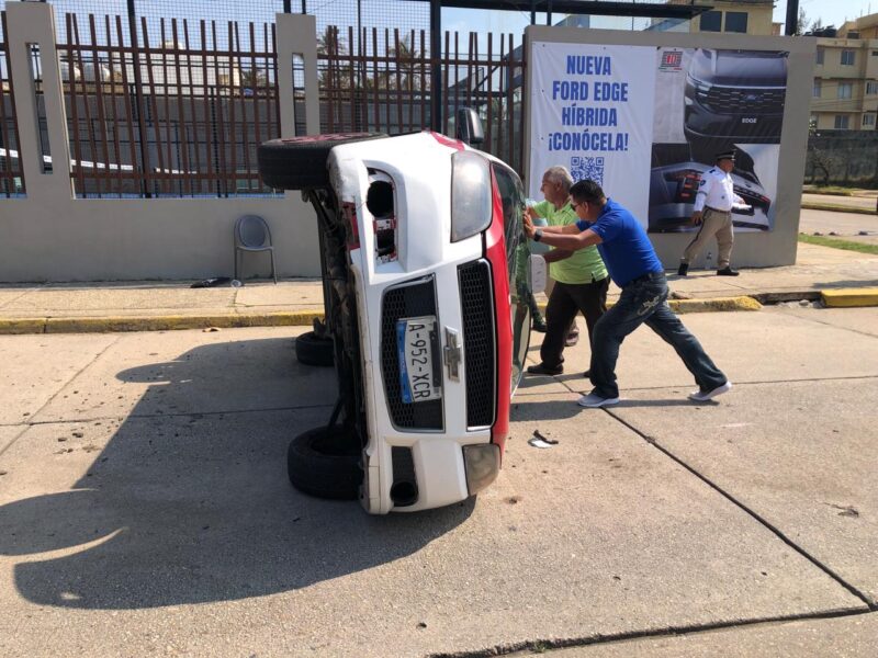 El vehículo que terminó volcado fue un automóvil marca Chevrolet, tipo Aveo, habilitado como taxi de este puerto, marcado con el número 1329, con placas A952-XCR, que manejaba el señor Raúl Maldonado García, un adulto de casi 60 años.