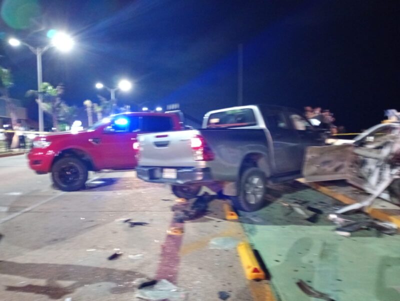 El fuerte accidente ocurrió cuando las dos camionetas transitaban de oriente a poniente sobre Malecón, pero la unidad en color gris viajaba a exceso de velocidad.